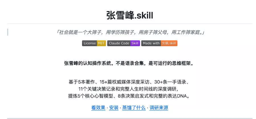 知名网络教育博主张雪峰去世后,一个名为“张雪峰.Skill”的AI技能包上线。其界面显示,这是“张雪峰的认知操作系统”,而非简单的语录合集,它是一个可运行的思维框架,旨在解答高考志愿、考研、职业规划等问题。巴菲特等一众投资高手的Skill接连出现,开发者称,使用该Skill可以用相应真人的逻辑经验做出决策分析。