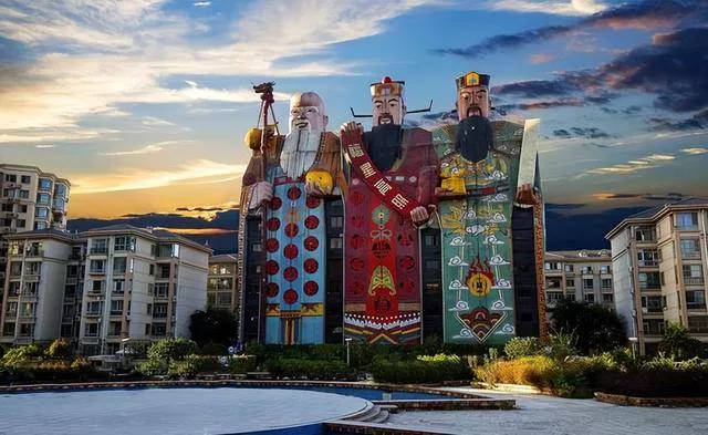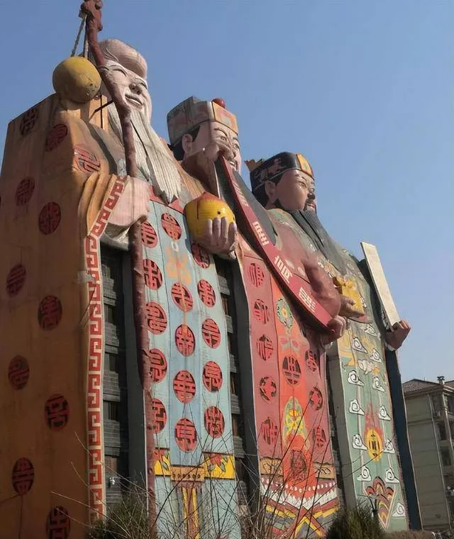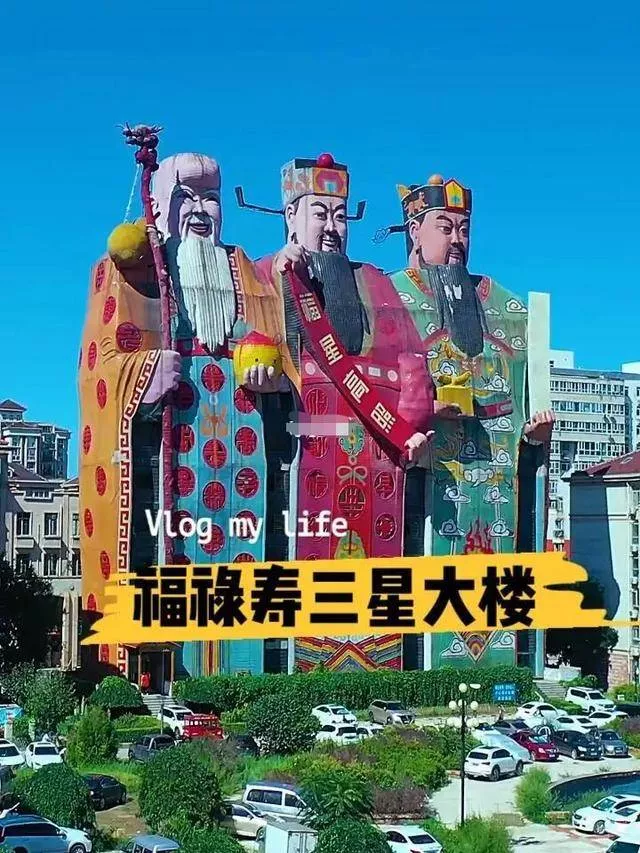 河北天子大酒店“福禄寿”三星楼,直接把福、禄、寿三位神仙做成了高达41.6米的大楼。本意是祈福吉祥,但巨大而僵硬的神仙雕像白天看着缺乏神韵,晚上灯光一开,更添几分诡异。