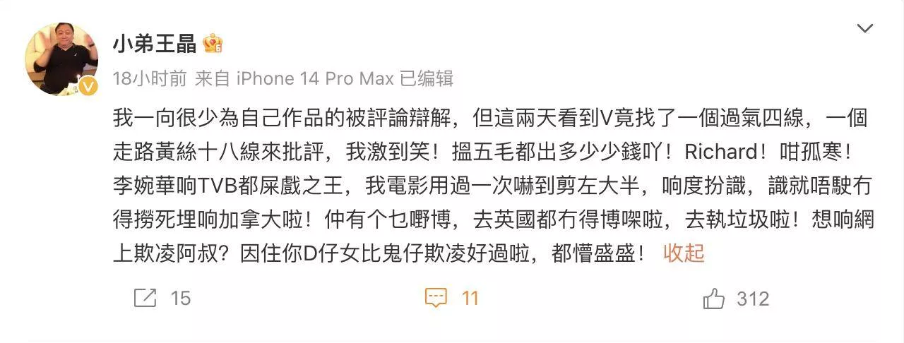 后来她做自媒体,又敢公开狂怼王晶的剧,王晶直接下场开骂,骂她是屎戏之王、过气四线演员。