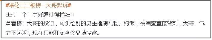 只是近期这种平衡状态被打破了,花三三被曝在这段感情中有异心,养“小男友”被榜一大哥发现后抛弃了,还跟她索要过往赠送的礼物,导致花三三不断变卖奢侈品筹钱,还试图模仿大佬新欢模样挽回。