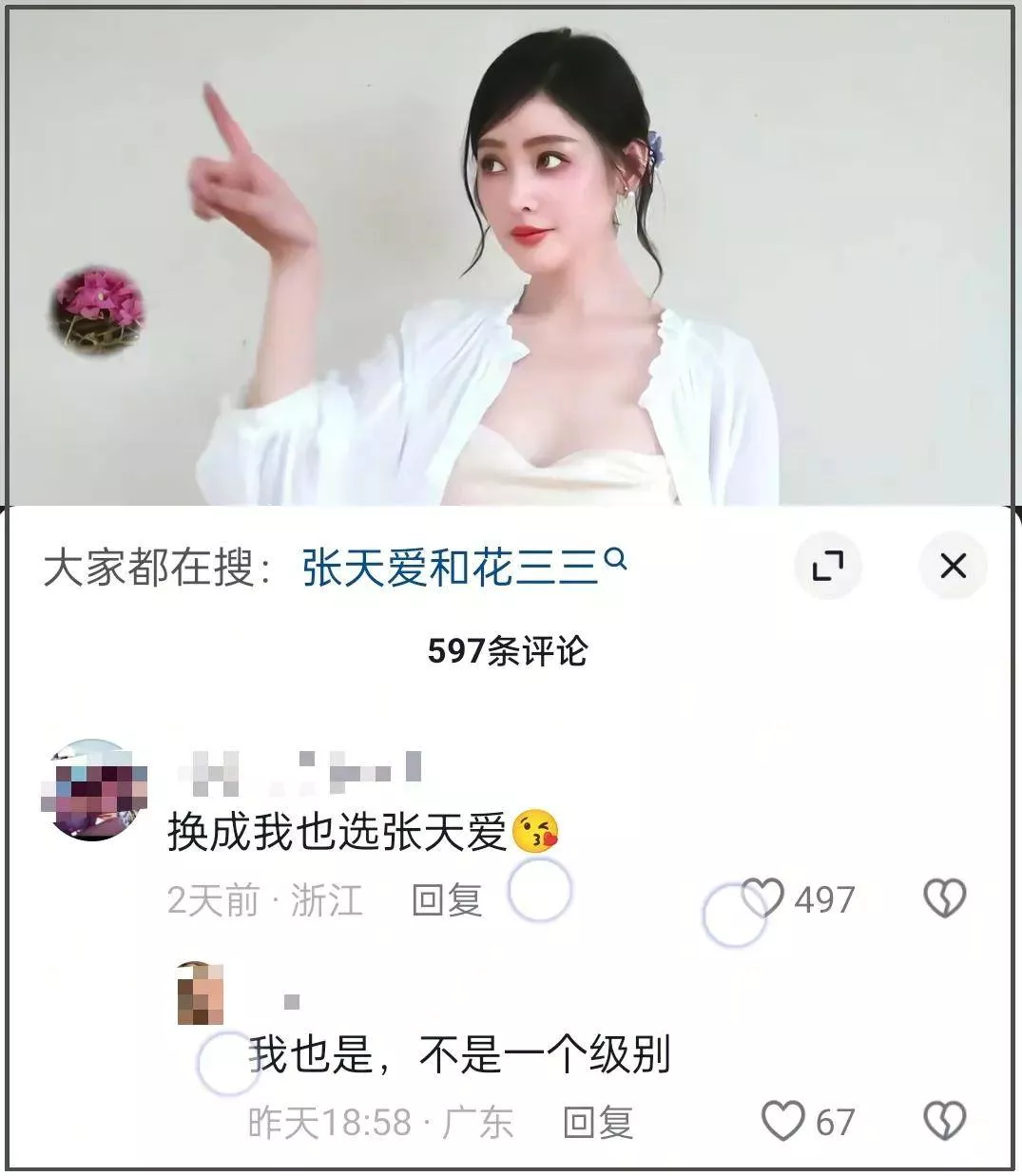 原本就是无实锤的爆料瓜,但或许是涉事主人公名声都很响亮的缘故,张天爱的社媒账号直接沦陷,弹幕和评论区都在提“华宵一”和“花三三”的名字,还有不少直接询问她是不是当小三了,影响极其恶劣。