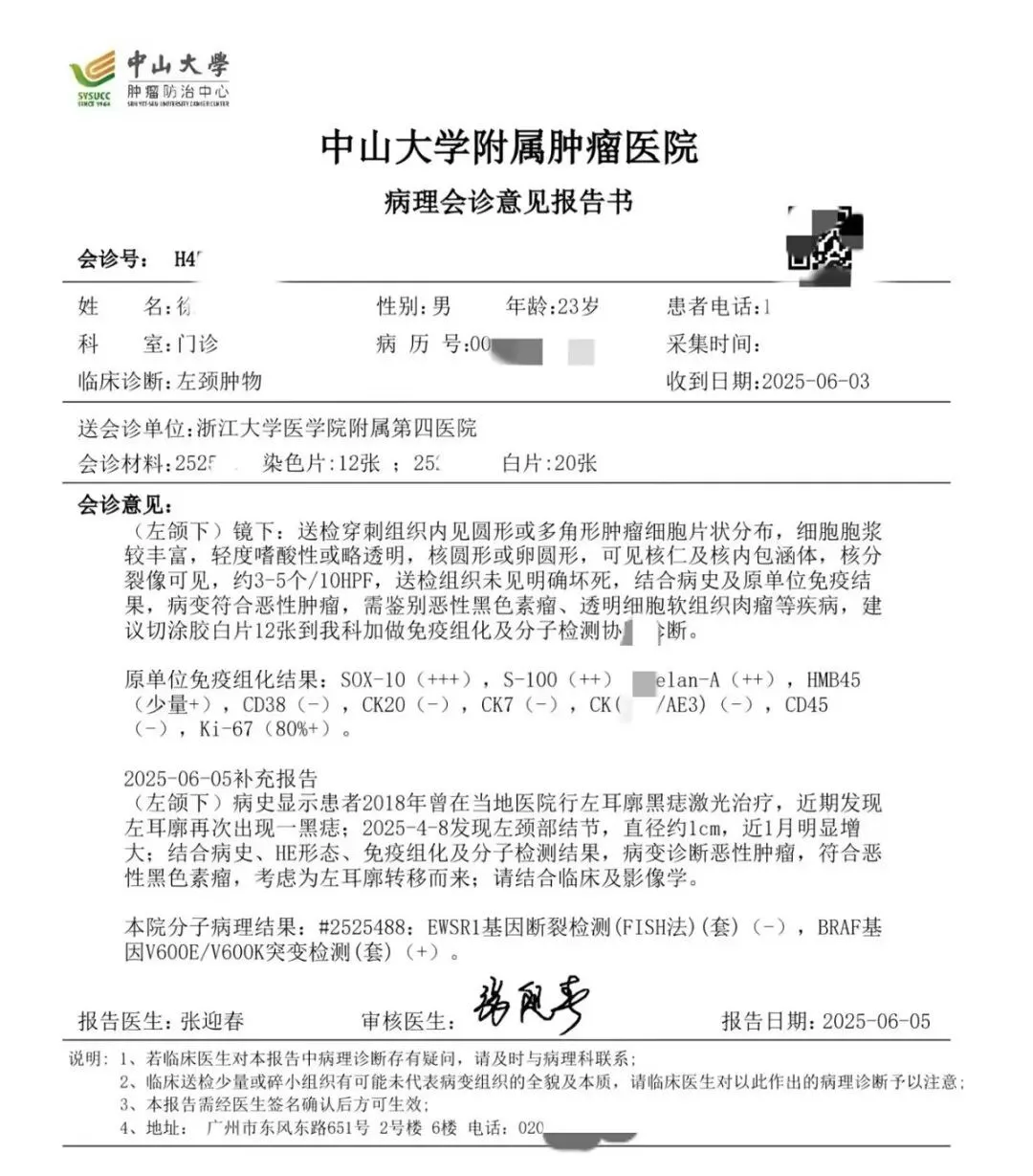 2018年耳边有一颗黑痣,一直变大,但当时没在意,还去小医院用雷射点掉。