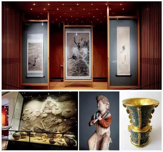 上图:东亚博物馆展厅展出中国古代绘画,中间一幅为北宋画家易元吉的作品。(图/网络);下左:瑞典东亚博物馆展厅内展出半山文化墓葬场景复原。(图/网络);下中:瑞典东亚博物馆馆藏中国陶制墓葬俑