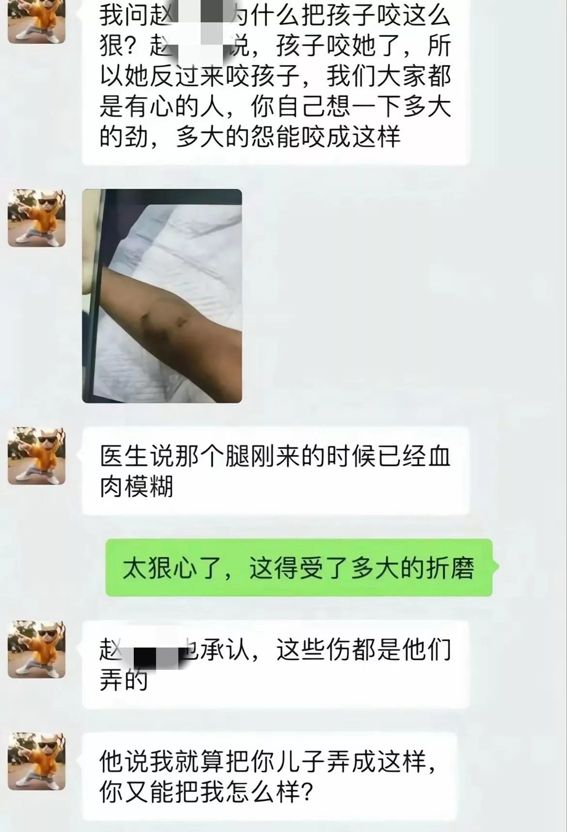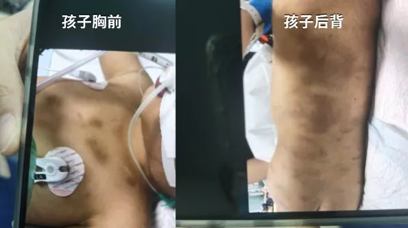 孩子生母马女士曾说,在医院见到孩子时,儿子脸上、眼部泛着青紫,浑身上下到处都是大大小小的淤青,小腿上还有一个醒目的环形伤痕,“我不知道那是什么造成的,即使已经挂了这么多天消炎药,还是通红通红的。”