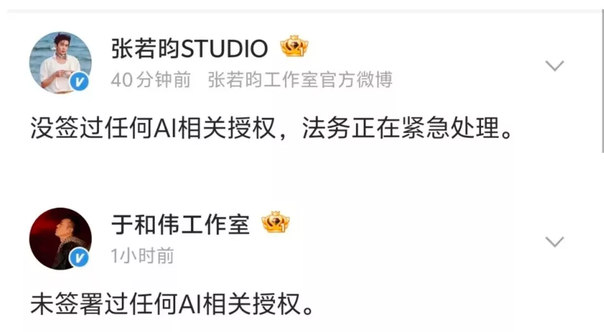 然而,在爱奇艺披露的入驻图表中,虽然包含陈哲远、曾舜晞等逾百位艺人,但内地演员张若昀、李一桐、于和伟、王楚然等团队随即发声否认签约,强调并未授权平台使用其肖像、声音或表演数据进行AI生成。