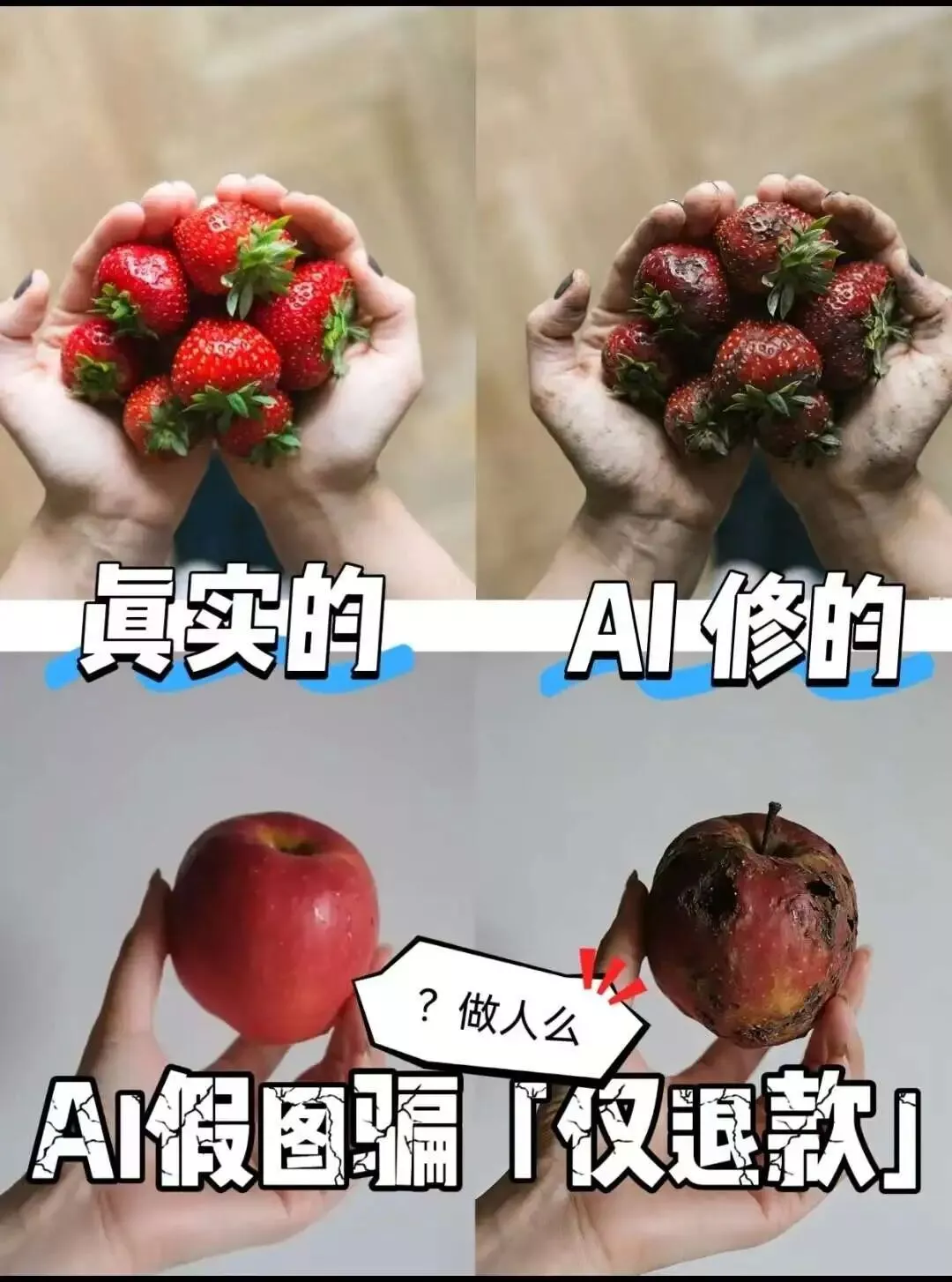 当这种造假变得毫无门槛,当退货的买家可以用 AI 瞬间生成一张毫无破绽的破损照片来仅退款时。