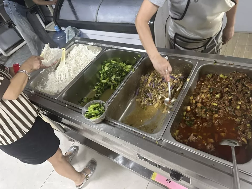 制衣厂包吃包住,工人们的晚餐是两荤一素。