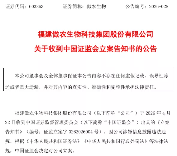 傲农生物(603363)公告称,公司于4月22日收到中国证监会出具的《立案告知书》。因公司涉嫌信息披露违法违规,根据《中华人民共和国证券法》《中华人民共和国行政处罚法》等法律法规,中国证监会决定对公司立案。立案调查期间,公司将积极配合中国证监会的调查工作,并严格按照相关法律法规及监管要求履行信息披露义务。