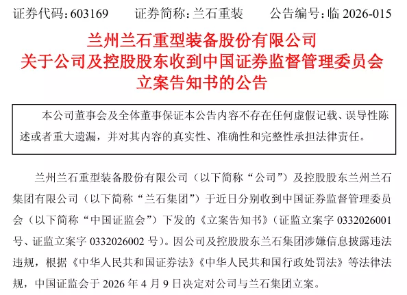 兰石重装(603169)亦发布公告称,因公司及控股股东兰石集团涉嫌信息披露违法违规,根据《中华人民共和国证券法》《中华人民共和国行政处罚法》等法律法规,中国证监会于2026年4月9日决定对公司与兰石集团立案。