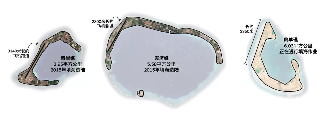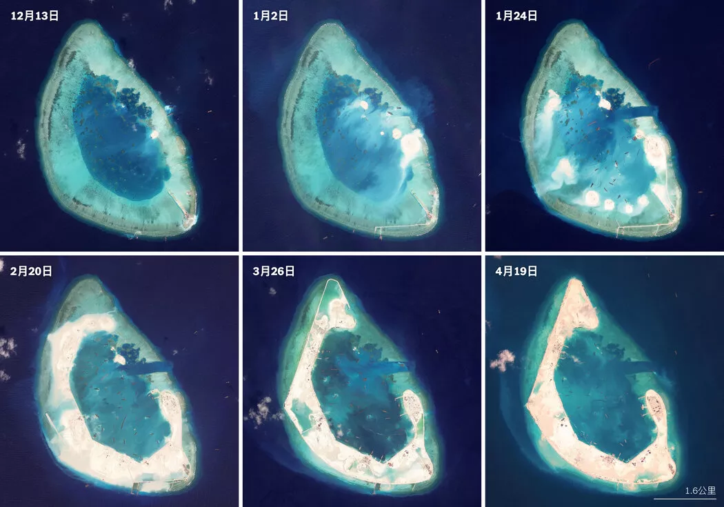 2013年至2017年间,中国在南中国海修建或扩建了20多个能够驻扎部队的军事前哨。其中包括位于南沙群岛(英文通用名称为斯普拉特利群岛——译注)的三处较大的军事基地以及西沙群岛的一处基地,南沙群岛距离中国大陆超过1400公里,但距菲律宾海岸不到500公里。这一规模和速度空前的填海造岛行动,引发了国际社会的谴责,并损害了中国与东南亚邻国以及美国的关系。