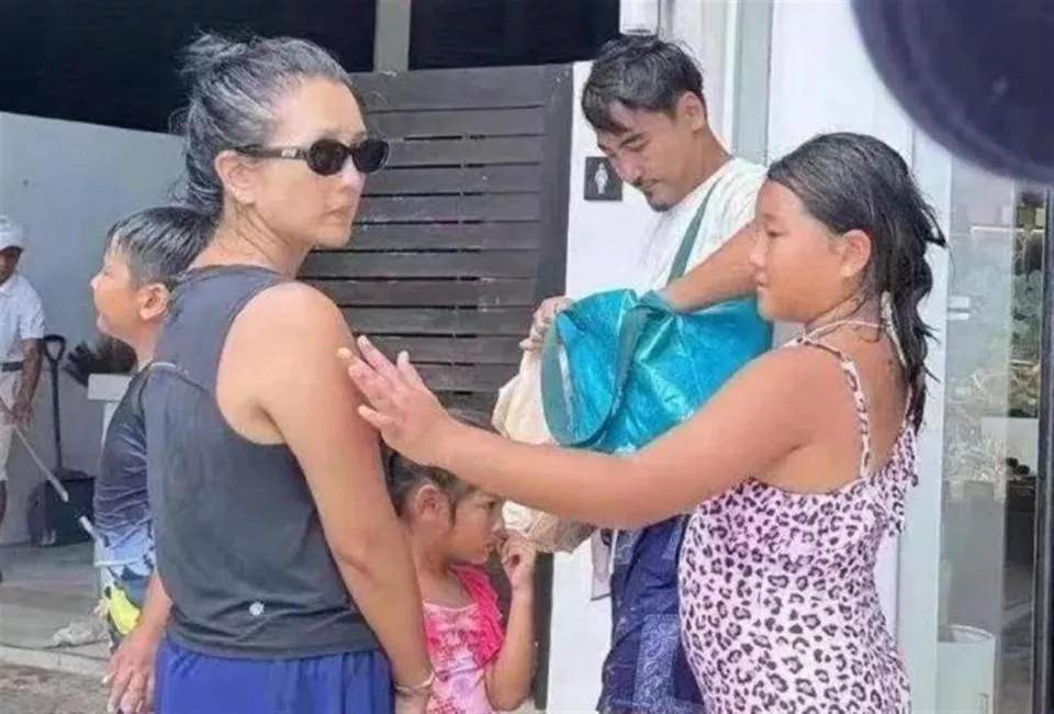 38岁的何洁在泰国街头被偶遇,满头白发抱着小女儿,身边站着两个身高差明显的女儿。