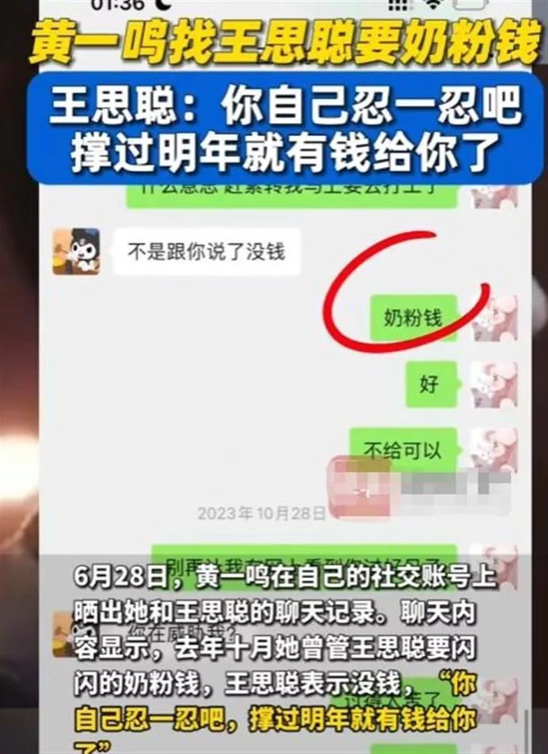 她晒出的聊天记录显示,她曾找王思聪要奶粉钱,对方的回复只有七个字:“没有钱,你忍一忍。 ”随后,她发现自己被全面拉黑。