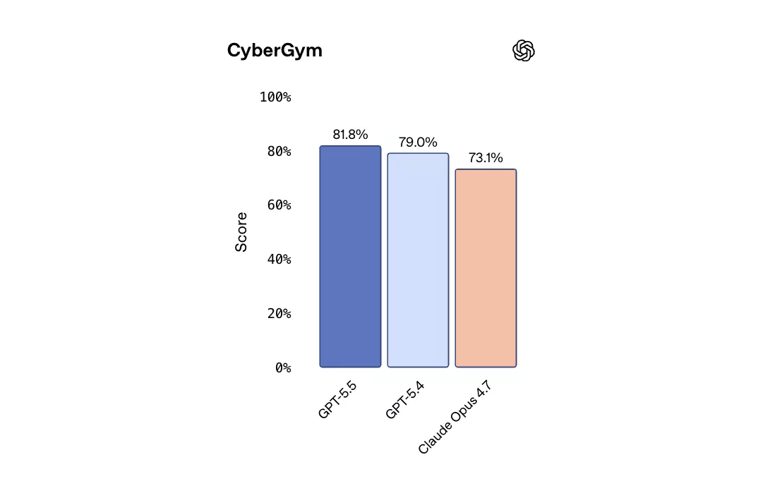 在网络安全基准CyberGym上,GPT-5.5得分81.8%,高于GPT-5.4的79.0%及Claude Opus