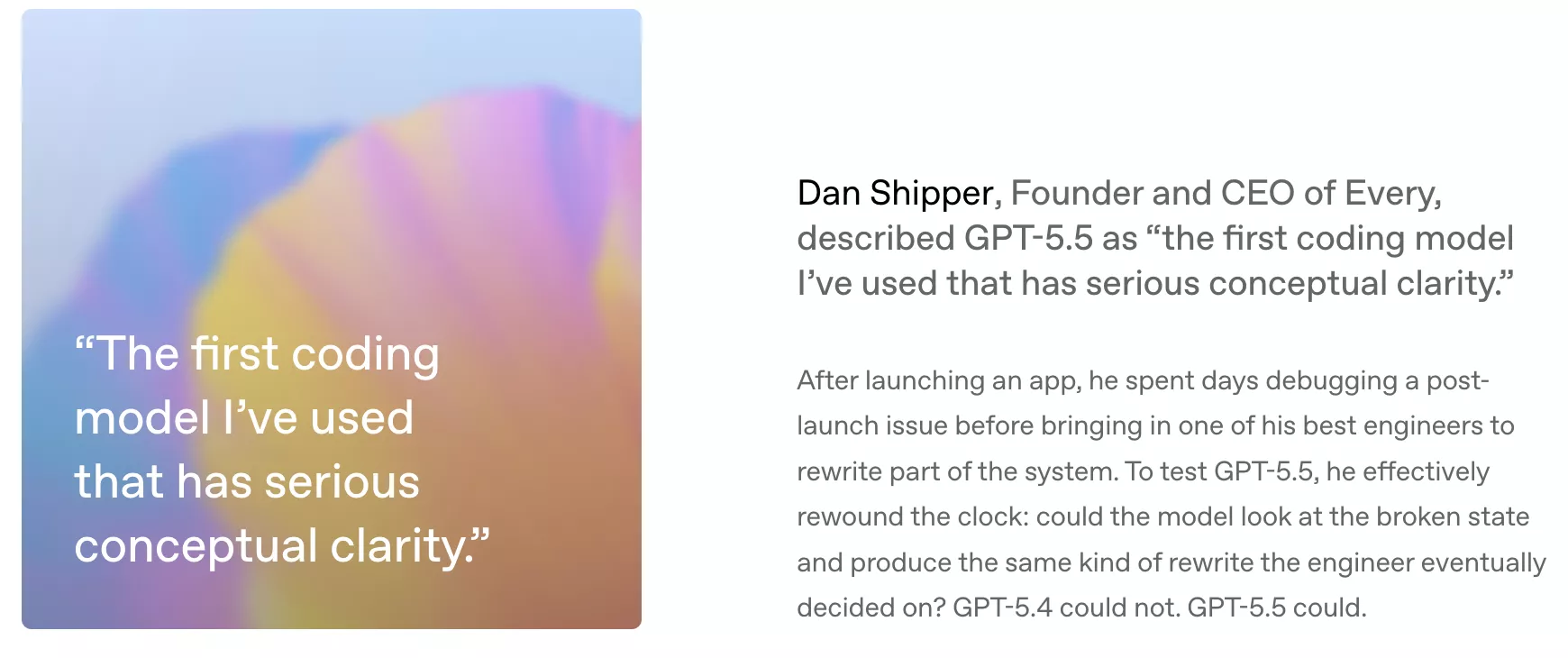 Shipper称GPT-5.5为"我用过的第一个具有真正概念清晰度的编程模型"。