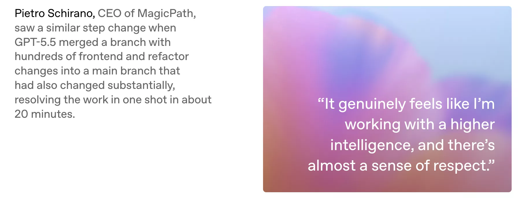 Schirano指出,GPT-5.5在约20分钟内一次性完成了一次涵盖数百项前端改动与重构更改的分支合并任务。其直言:“感觉就像是在和更高层次的智慧生物一起工作,甚至会产生一种敬畏之情。”