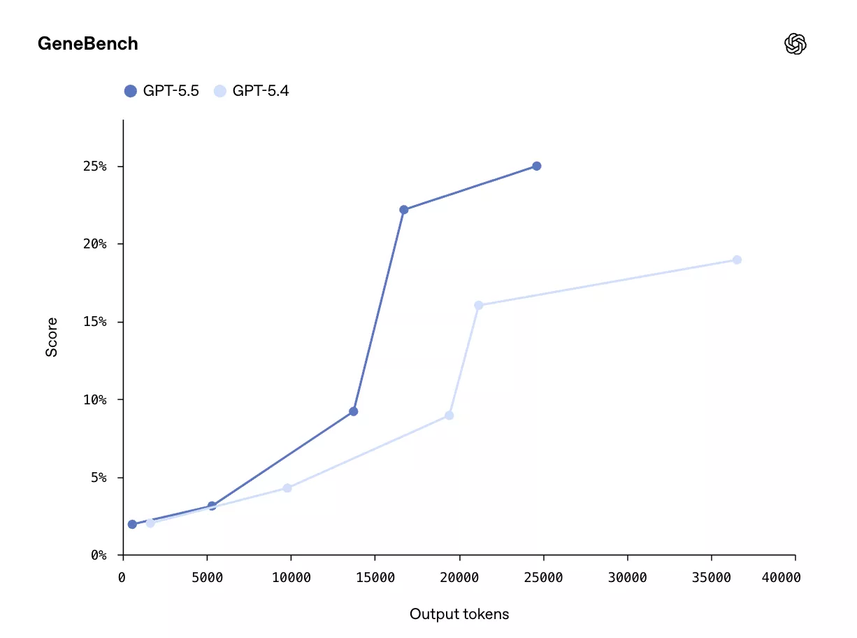 在专注于遗传学与定量生物学多阶段数据分析的GeneBench测试中,GPT-5.5得分25.0%,高于GPT-5.4的19.0%;GPT-5.5
