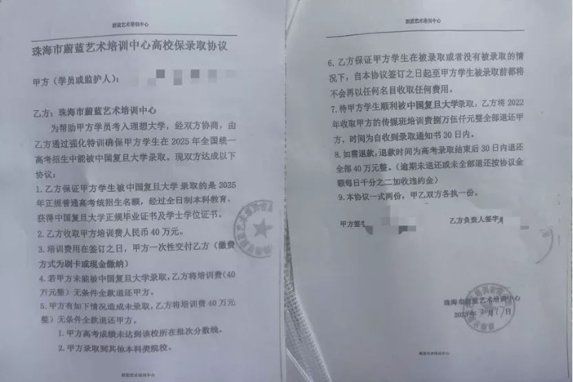 这种“保录”对赌协议并不新鲜,前些年集中出现在留学申请中,费用按照海外学校的排名,从一百万到三百万不等。2024年,多名学生花70万,通过中介保进香港大学,后来因入学材料有问题被退学。今年初,又出现了“寒假学堂营”“教授内推”等骗局,还是打着“保录”名头,进行饥饿营销。