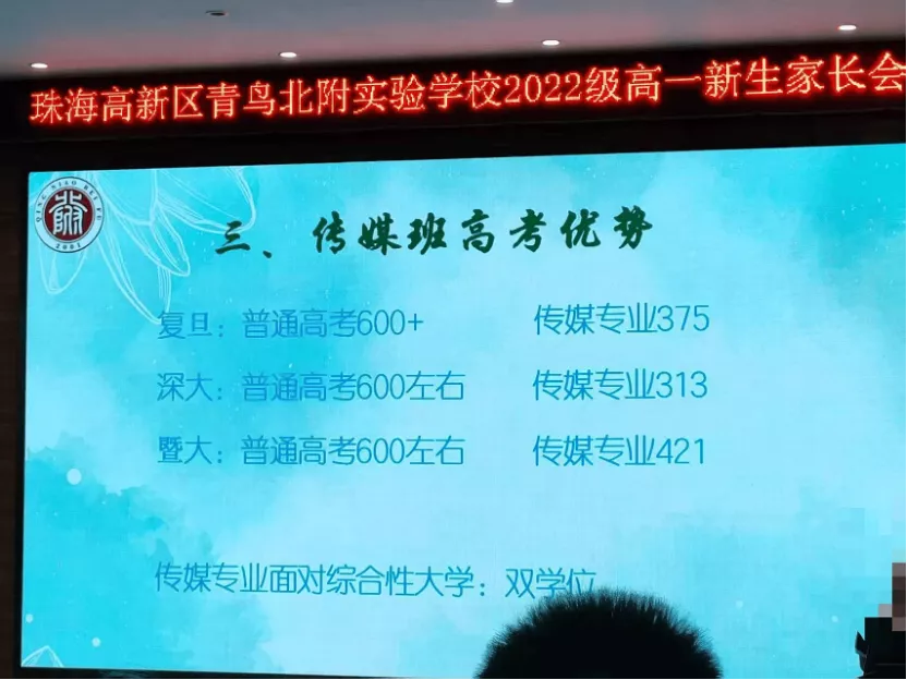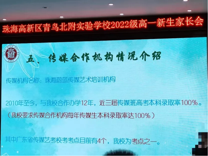 这是与青鸟北附合作了12年的艺术培训机构,叫珠海蔚蓝传媒,宣称的升学率十分惊艳——“近三届传媒班高考本科录取率100%”。一位家长转述时强调:“是本科哦,不是专本升学率”。2022年一开学,新生和家长坐满礼堂,高中部教务主任直接介绍了这个特色班。