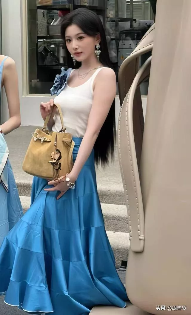 这次蓝色吊带裙贴身,把她过瘦的缺点无限放大,没有女性该有的柔美感,反而显得干瘪。