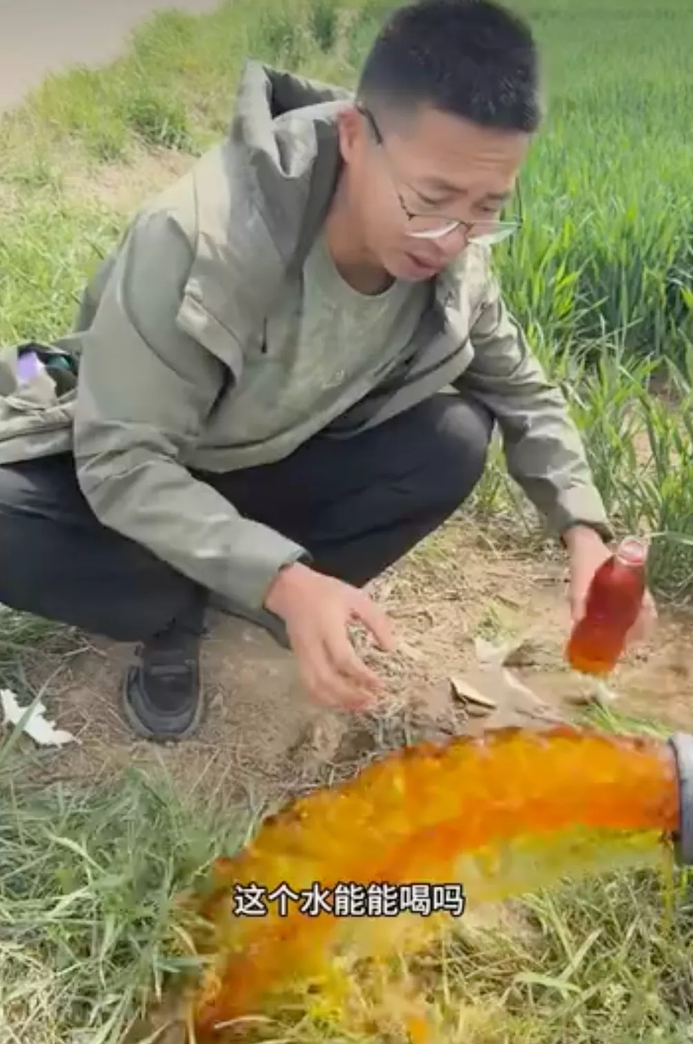 内地有环保博主揭露河北保定市蠡县一农田部分区域地下水呈深红色。(影片截图)