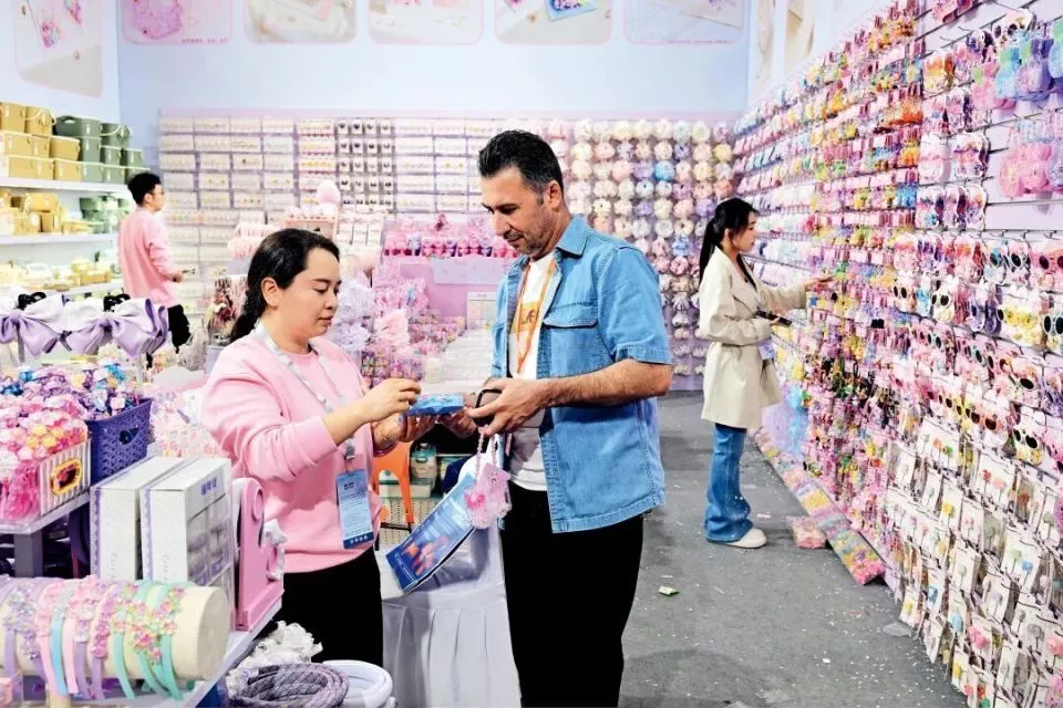 4月12日,在2026中国义乌国际日用百货创新博览会上,伊朗外商在洽谈DIY手工串珠采购业务。