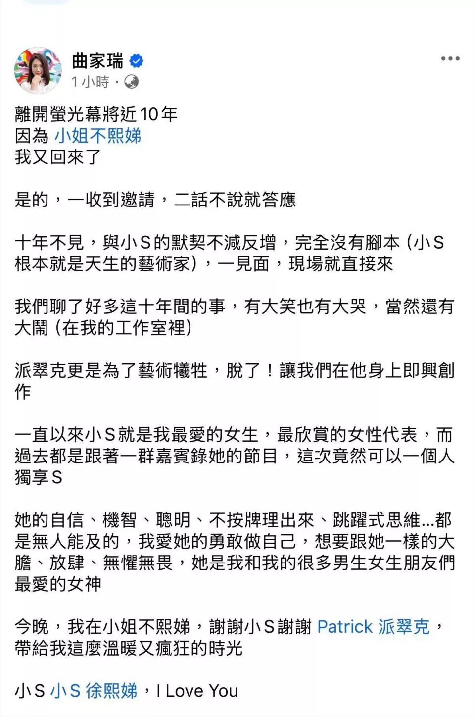 曲家瑞则尤其让人感动,自《康熙来了》结束后,她就没有再参加综艺节目录制,这次重聚,也是她和小S多年后的再次见面。