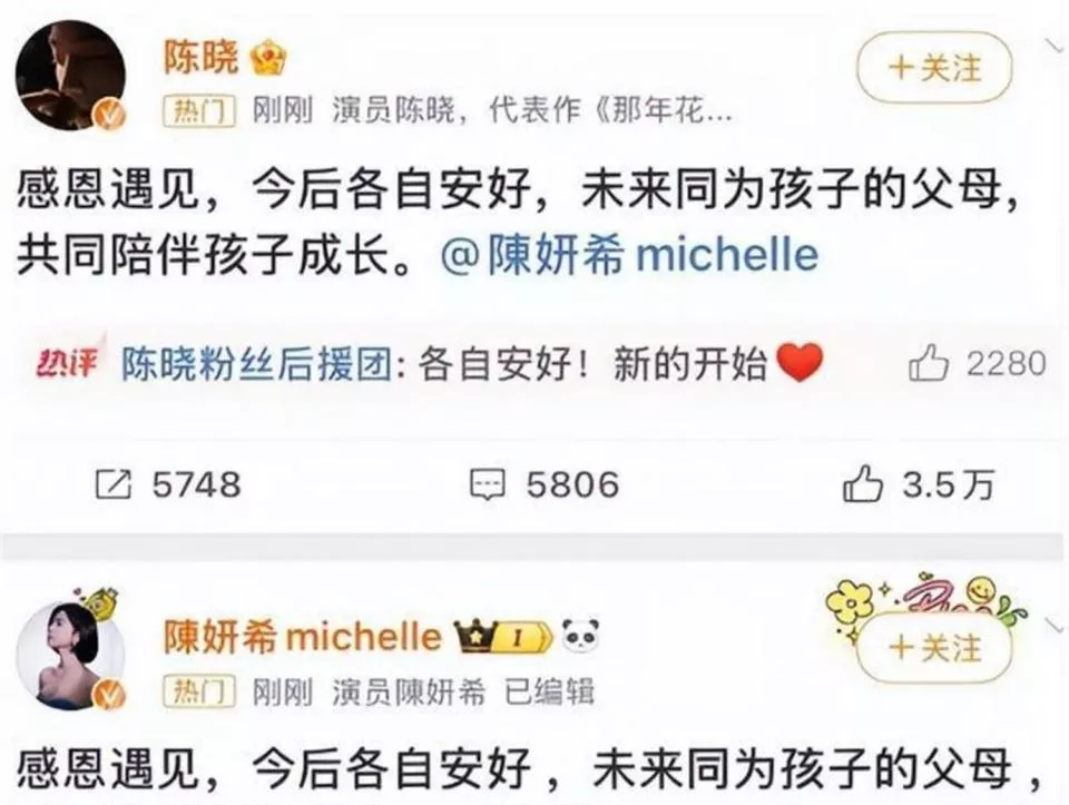 在这漫长的七年里,陈妍希选择了隐忍。 当时她和陈晓的婚姻还在存续期,她或许是为了家庭,为了孩子,一直没有采取法律行动。 转机出现在2025年2月18日,陈晓和陈妍希同时在微博发文,官宣离婚,声明“感恩遇见,各自安好”。