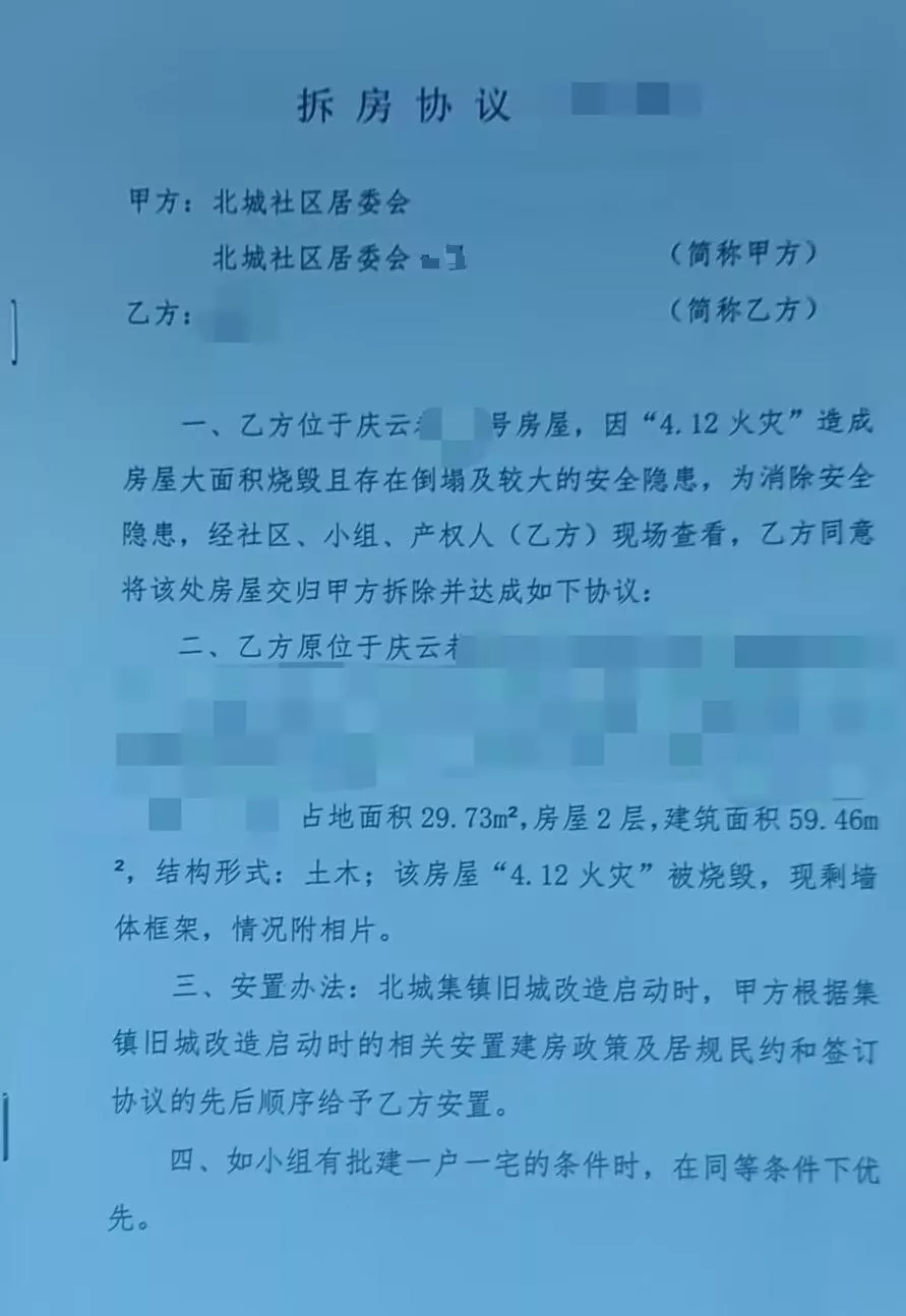 赵明向极目新闻记者提供了一份当时他与甲方北城社区居民委员会签署的拆房协议,拆房协议写明,赵明的老宅占地面积29.73平方米,房屋2层,建筑面积59.46平方米,该房屋因火灾被烧毁,现剩墙体框架,“因火灾造成房屋大面积烧毁且存在倒塌及较大的安全隐患,为消除安全隐患,经社区、小组、产权人(乙方)现场查看,乙方同意将该处房屋交归甲方拆除并达成协议”。