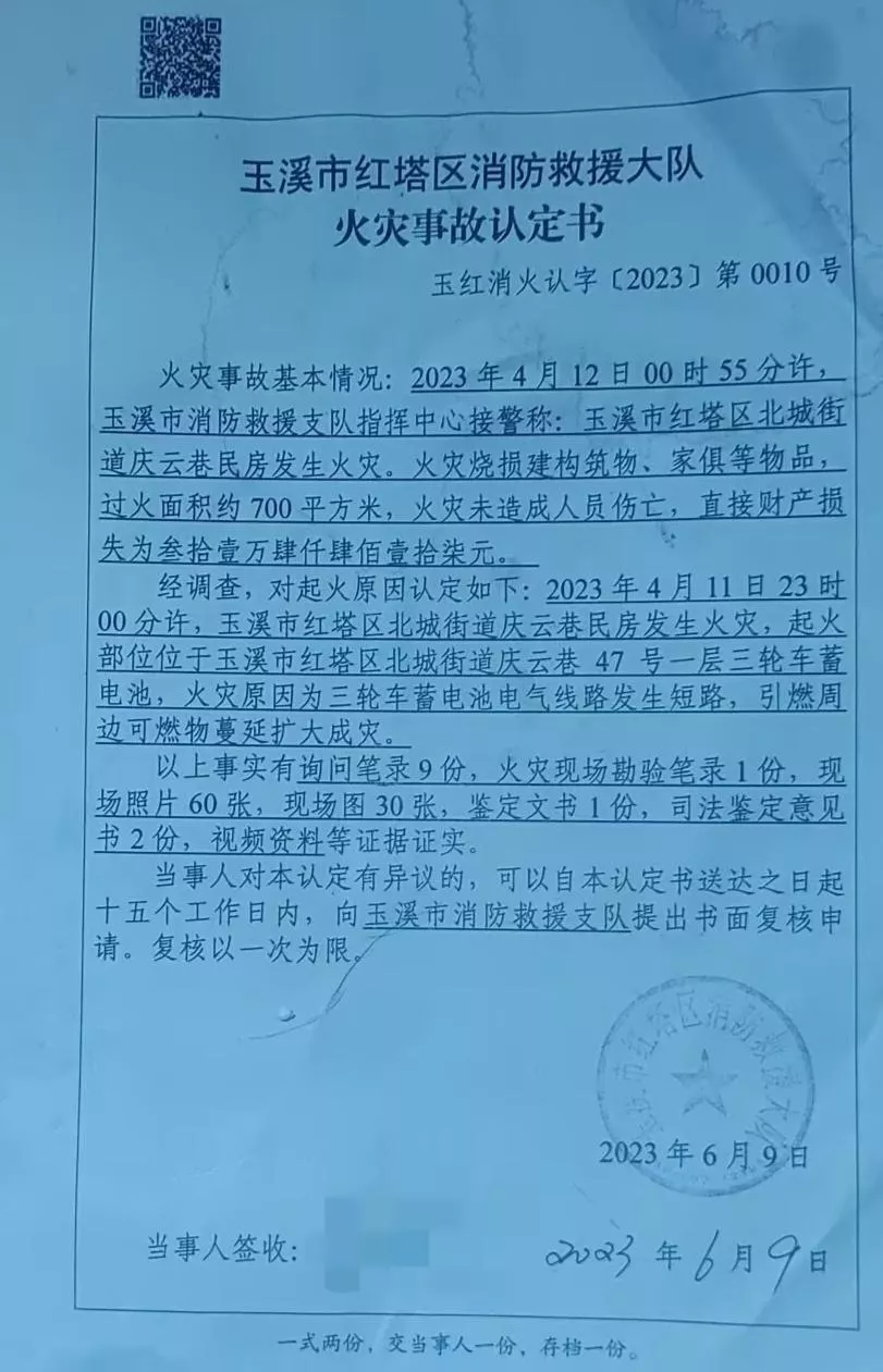 2023年6月9日,火灾发生57天后,玉溪市红塔区消防救援大队出具此次火灾的事故认定书,认定书载明,2023年4月11日晚11时许,北城街道庆云巷民房发生火灾,起火部位位于庆云巷47号一层三轮车蓄电池,火灾原因认定为三轮车蓄电池电气线路发生短路,引燃周边可燃物蔓延扩大成灾。