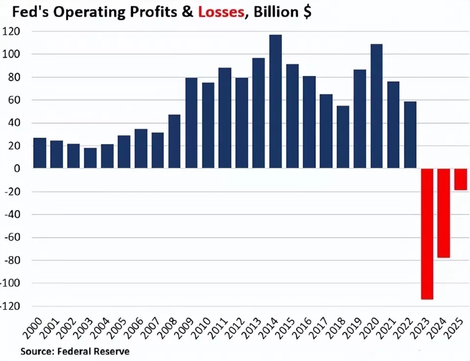然而这一切并非没有代价,根据美联储披露的财务报告显示,2025年美联储的营业亏损达到了187亿美元,持续三年时间都是亏损的,亏损总额达到了2103亿美元,折合人民币达到了1.5万亿左右。