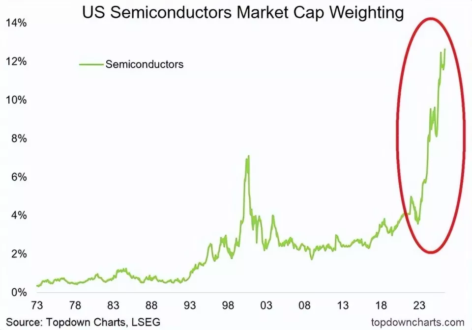 美联储这些年印出来的钱,全部被华尔街拿去投资了美国的半导体市场,目前美国半导体股票的市值已经达到了美股总市值的13%,这个比例是2000年互联网泡沫时期的两倍之多。