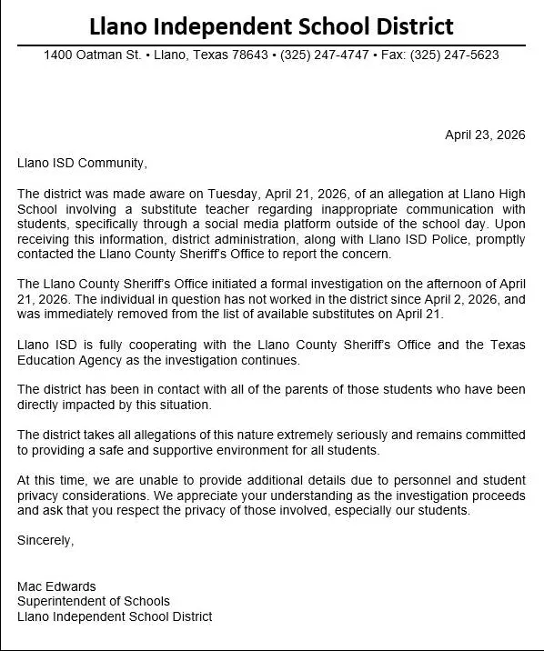 《纽约邮报》24日报道,拉诺独立学区(Llano Independent School District)总监爱德沃尔兹(Mac Edwards)在致学生家长的一封信中表示,学校官员向警方举报帕尔马拉斯“在课余时间透过社交平台与学生进行不当沟通”,她其后被捕。