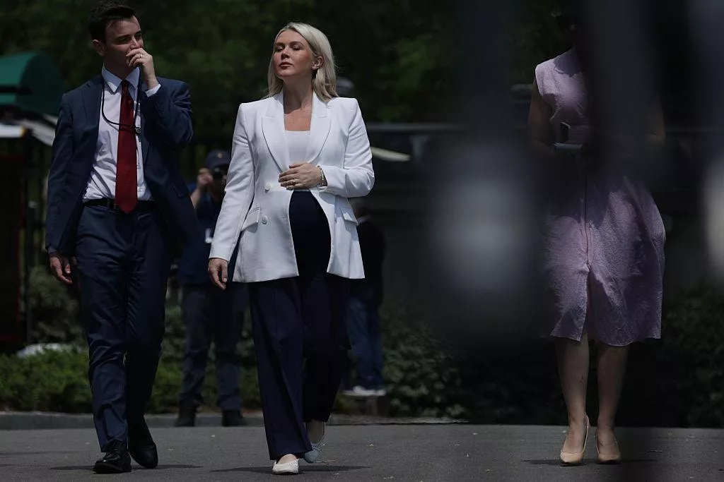 2026年4月24日,美国华盛顿特区,图为莱维特步出白宫,可见她腹部隆起怀有身孕。(Getty)