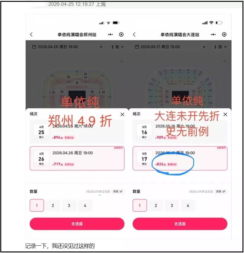 不仅如此,网友深扒之后还发现,单依纯演唱会票价不是第一次跳水了,还有过没等开票就先打折的情况,已然形成了连锁反应。