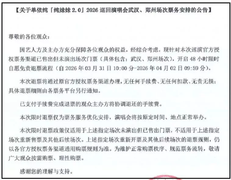要知道单依纯最新两场演唱会可是经历了一波免费退票呢。