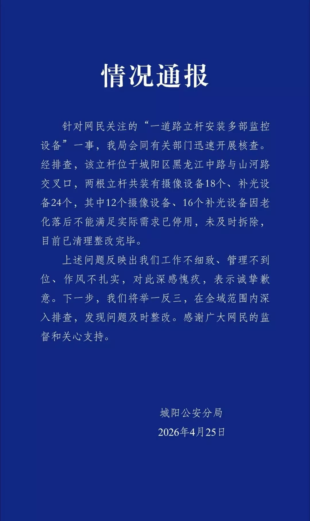 通告指,经排查,该立杆位于城阳区黑龙江中路与山河路交叉口,两根立杆共装有摄像设备18个、补光设备24个,其中12个摄像设备、16个补光设备因老化落后不能满足实际需求已停用,未及时拆除,目前已清理整改完毕。