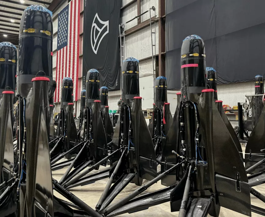 Anduril公司厂房内整齐排列的黑色无人机武器