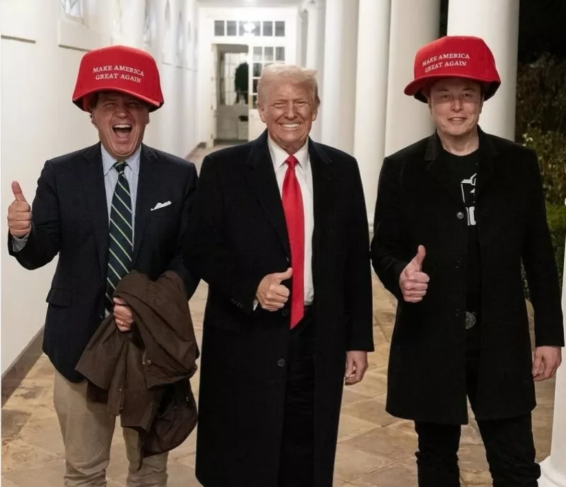 2025年初,特朗普、卡尔森(左一)、马斯克在白宫合影。 Instagram