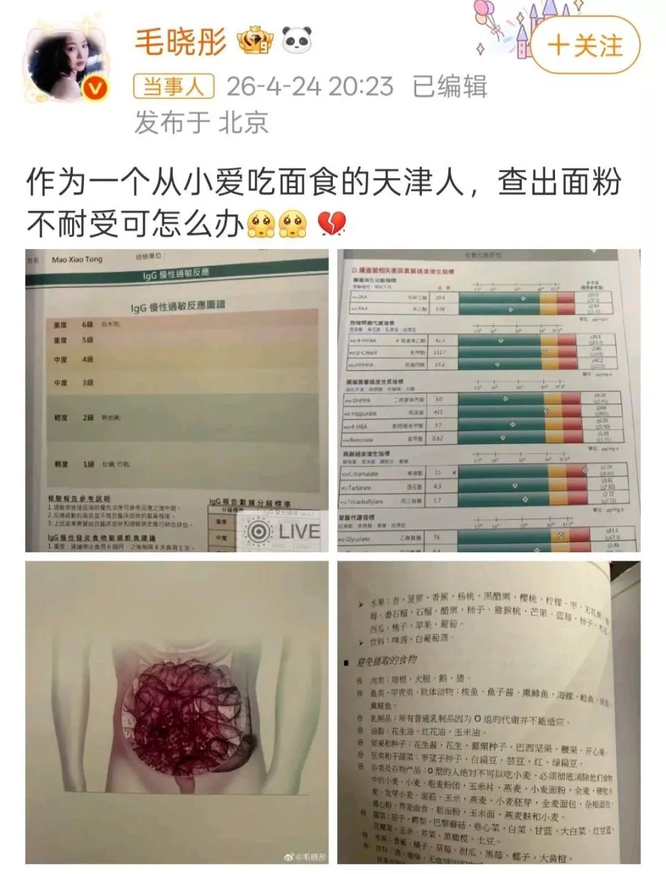 毛晓彤还结合自己天津籍的身份,幽默化解了这场争议。大家都知道,天津人特别爱吃面食,包子、饺子、面条都是家常便饭,查出面粉不耐受,对她来说无疑是不小的饮食困境。她发文调侃这件事,既缓解了争议的尴尬,也让大家看到了她接地气的一面。
