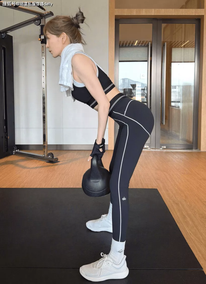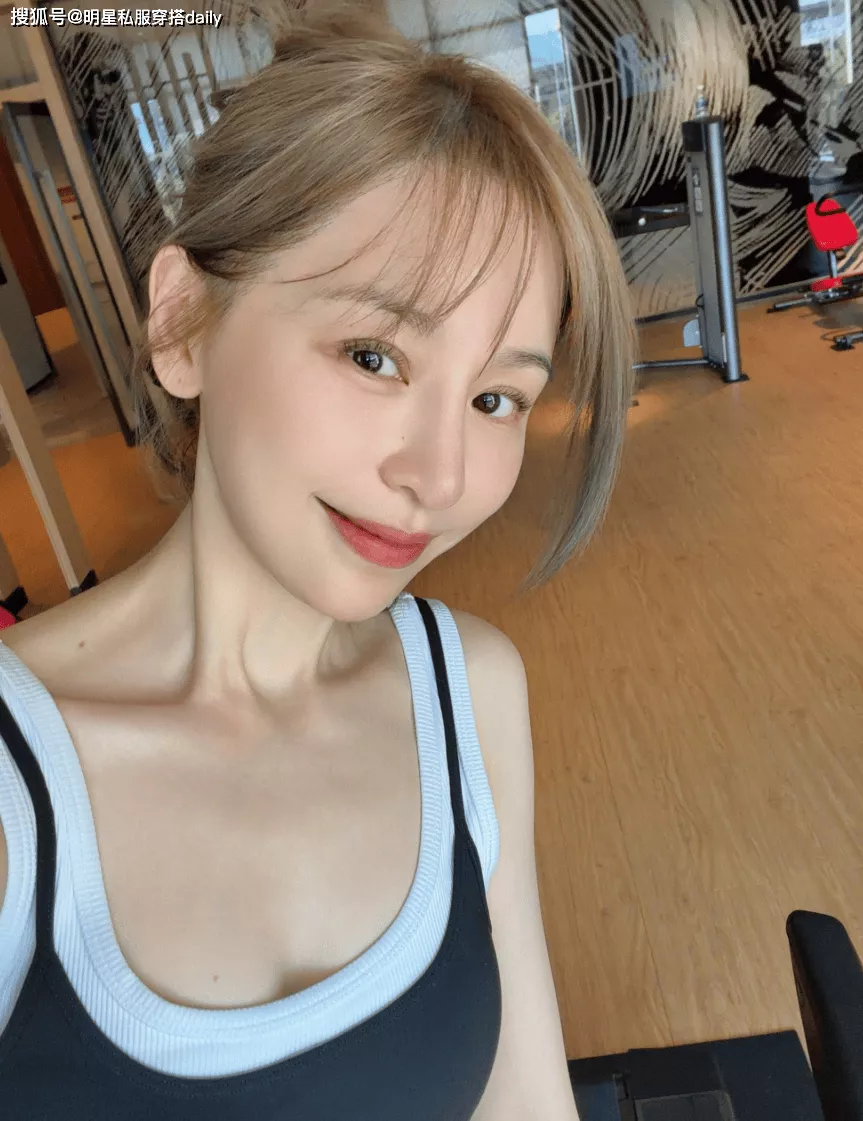 当然健身美照如此出众,穿搭也是加分项!比如这次健身运动套装不仅配色简约大气,而且开始极显身材!上半身是黑白撞色短背心,搭配黑色修身瑜伽裤,脚踩白色运动鞋和白色短袜,身材整体看起来线条流畅柔美,看起来像二十几岁,身材确实非常好!