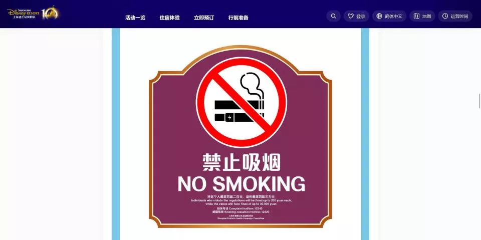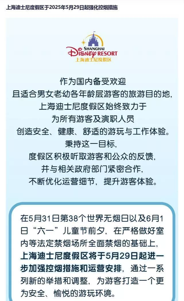 2025年5月,上海迪士尼方面公告称,在严格做好室内等法定禁烟场所全面禁烟的基础上,将于5月29日起进一步加强控烟措施和运营安排。具体措施包括减少或调整“指定吸烟区”、增强标识指引、全方位提醒游客遵守控烟规定等。该度假区还表示,呼吁每一位游客的遵守和配合,做到室内全面禁烟,室外不吸游烟,遵守乐园须知,仅在指定吸烟点吸烟。