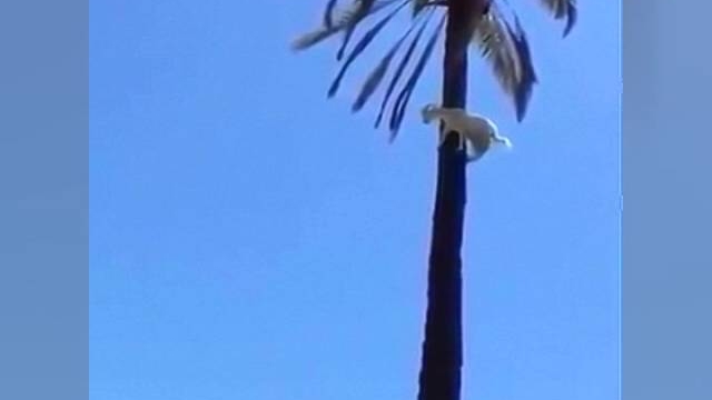 成精了!这只羊竟爬上棕榈树顶 东张西望看风景
