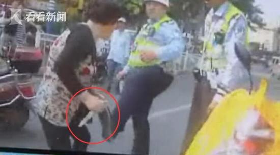 大妈闯红灯被拦拔刀伤警 被制服后又倒地"躺尸"